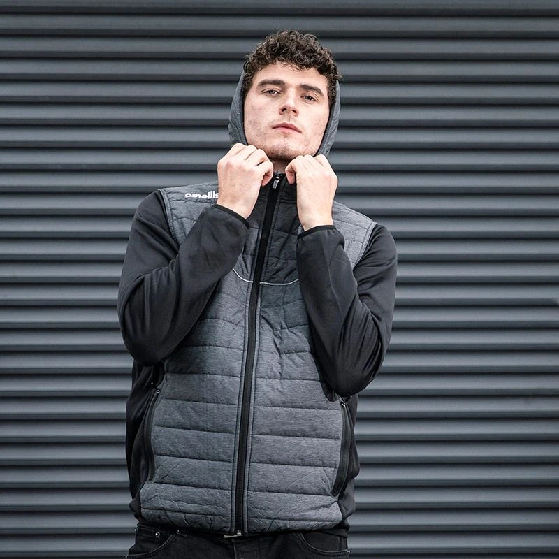 The Harrison jacket features a lightly quilted body combined with a soft poly side panel and sleeves. Design features include a snug hood with drawcord finish, reflective panel across front chest and stretch binding hems to help retain heat and provide warmth and comfort.